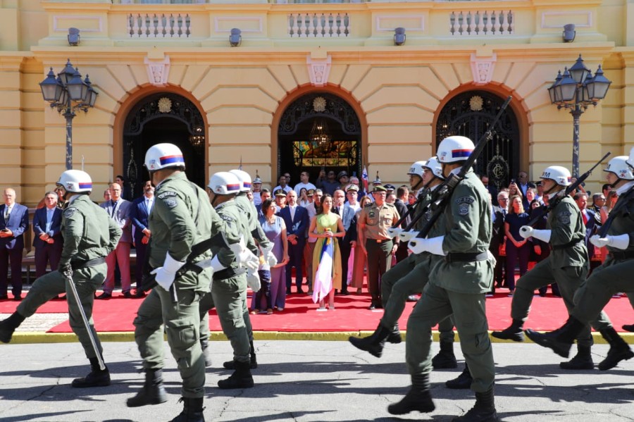 Em frente ao Palácio do Campo das Princesas, a gestora recebeu as continências regulamentares, foi apresentada à Guarda de Honra e realizou a revista da tropa. "Estamos celebrando aqueles que vieram antes de nós, lutando as mesmas lutas, por mais democracia, justiça, por um governo que chegue verdadeiramente na vida daqueles que mais precisam. Que possamos honrar o legado e as tradições daqueles que colocaram a sua vida em favor do povo pernambucano", completou Raquel Lyra.